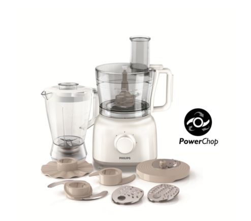 Datorita tehnologiei Power Chop tocarea alimentelor se realizeaza la fel de bine ca si la un aparat dedicat (masina de tocat carne). Cu tehnologia Power Chop putem toca la fel de bine ingrediente de consistenta moale sau tare. Tehnologia Power Chop este o combinatiei intre forma lamei si unghiul de taiere obtinand rezultate impresionante la tocare (indiferent de combozitia ingredientelor). Acest model detine 5 functii pe care le indeplineste foarte bine prin intermediul accesoriilor numeroase cu care a fost dotat: accesoriu framantat cu capacitatea de 0,5 Kg, disc emulsionare, disc feliere mare, disc granulare, disc radere mare disc de emulsifiere pentru albus de ou si frisca. Discul de emulsifiere este un instrumentul perfect pentru bătut rapid, la viteza redusa a ouălelor sau frişcă bătută, pentru pregătirea unor deserturi delicioase.