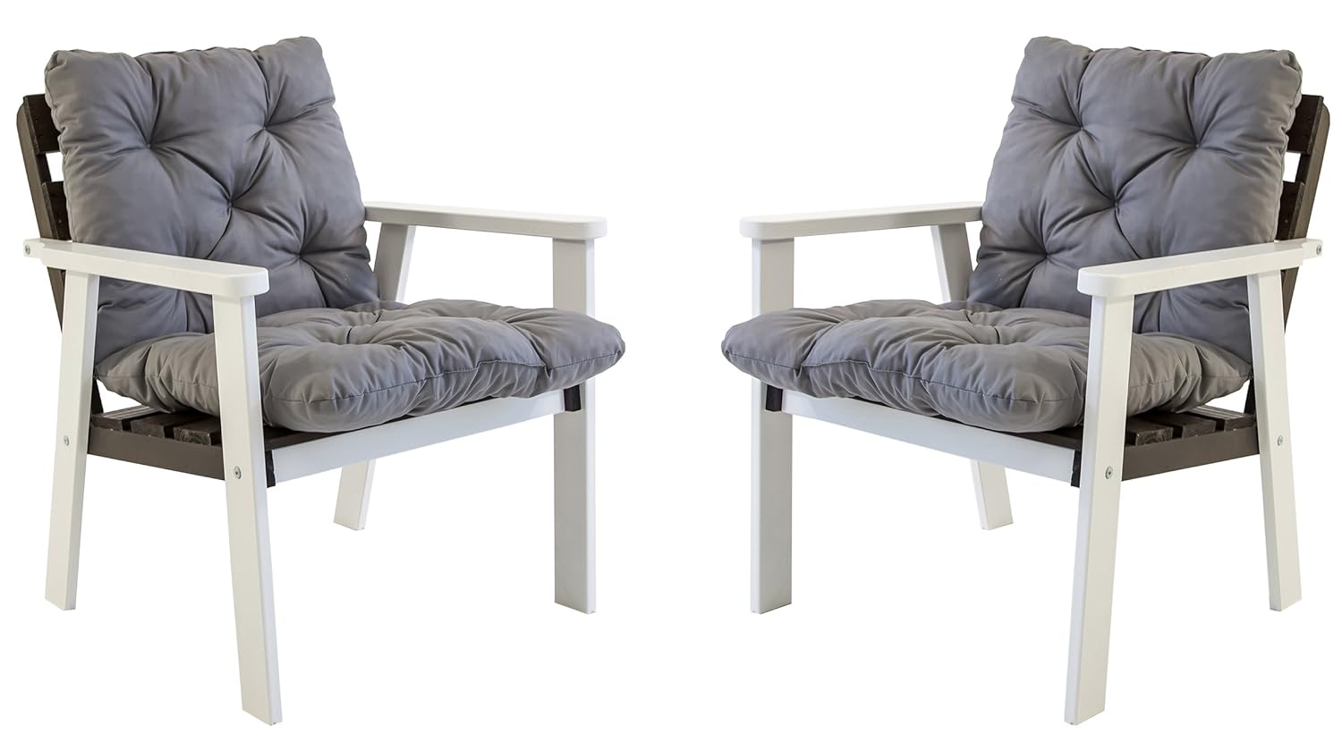 Mobilierul produs astfel rezista foarte bine conditiilor meteorologice extreme. Cadrul din lemn masiv de pin este certificat FSC, rezistent la lumina soarelui. Lemnul este tratat si cu solutii fungicide, in timp ce fibra speciala din material sintetic din care sunt facute pernele, asigura durabilitatea pe termen lung a mobilierului in: ploaie, soare, cald si rece, in acelasi mod. Acest set de gradina/terasa de culoare alb/gri cu vopsea de apa TEKNOL Aqua 1410, ce face parte din oferta este compus din 2 scaune din cadru din lemn prins in suruburi capsate, cu spatar si cotiere de sprijin. O canapea de doua locuri din cadru din lemn prins in suruburi capsate, cu spatar si cotiere de sprijin cu aspect modern si o masuta din cadru din lemn cu blat din sipci din lemn. Pentru un plus de confort, scaunele si canapeaua au incluse perne pentru sezut si spate din material textil poliester de 170gr./mp. Pernele scaunului si a canapelei de culoare gri deschis au o grosime de 5 cm. avand umplutura dintr-un burete moale si confortabil, care impreuna cu suprafata sintetica este foarte rezistenta la factorii externi agresivi. Greutate maxima admisa pe fiecare scaun este de 100 Kg.
