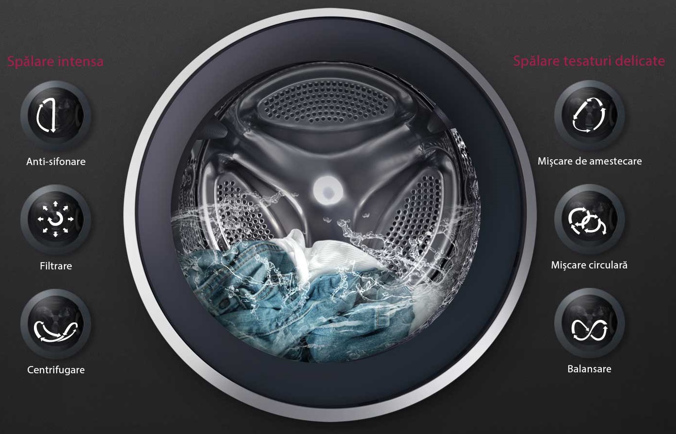 Cuva masini este facuta dintr-un material termorezistent polipropilena iar tamburul este din otel inox cu o capacitate de 42 de litri, avand diametrul hubloului de 30 cm. Deschiderea hubloului se realizeaza la 150 de grade. Datorita design-ului unic LG, 6 Motion Direct Drive poate realiza miscari variate ale tamburului sau o combinatie de miscari diferite în functie de programul de spalare ales. Mai pe intelesul tuturor, pentru fiecare tip de material, masina de spalat va efectua cate o combinatie specifica de miscari ale cuvei. Totul a fost studiat pentru obtinerea rezultatelor perfecte de spalare. Această functie, împreună cu viteza de rotire controlată si cu abilitatea tamburului de a se roti atat spre stanga, cat si spre dreapta, contribuie la îmbunatatirea semnificativa a performantelor de spalare, oferind rezultate perfecte de fiecare data. Aceste 6 tipuri de miscari de spalare permit o spalare personalizata pentru toate tipurile de materiale si ofera o performanta de spalare imbunatatita.