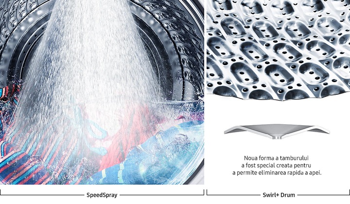 Datorita sistemului automat de reglare a consumului de apa, aportul de apa este ajustat electronic in functie de cantitatea si tipul rufelor, pentru obtinerea celor mai bune performante de spalare si consum energetic. Acest model are prevazut o rezistenta electrica ceramica Ceramic Heater, avand mai putina depunere de calcar pe rezistenta, ce asigura o mai buna protectie impotriva coroziunii. Design-ul unic, usor ondulat, al tamburului Diamond Drum, cu margini finisate in forma de diamant, este extrem de delicat cu hainele. Orificiile mici de evacuare a apei ajuta, de asemenea, la protejarea tesaturii, impiedicand prinderea hainelor. Samsung dispune de doua sisteme care ajuta la scaderea vibratiei si zgomotului: Design-ul special al peretilor laterali ai masinii de spalat reduc foarte mult zgomotul si nivelul vibratiilor in timpul spalarii, iar sistemul electronic de control al balansului, distribuie uniform rufele in interiorul masinii diminuand si mai mult zgomotul si vibratiile. Tehnologia Quick Drive reduce timpul de spalare cu pana la 50 % iar utilizarea de energie electrica cu 20 %, fara a compromite performantele la spalare.Tamburul unic Q-Drum are partea din spate mobila ce actioneaza ca un pulsator miscand apa in directii diferite fata de miscarea normala a tamburului asigurand o spalare mult mai rapida fata de alte masini mai conventionale. O alta tehnologie, Air Bubble Wash foloseste milioane de bule de aer care patrund in fibre care apoi sunt dispersate pentru a genera energie de impuls, pentru a obtine o curatare eficienta si la temperaturi joase. Datorita acestor bule, se va reduce frecarea atat dintre haine cat si dintre haine si tambur, astfel tesatura hainelor va fi protejata. Bulele activeaza detergentul, astfel ca acesta penetreaza rapid materialul si elimina murdaria cu usurinta, chiar si in apa rece la temperatura de 15°C.