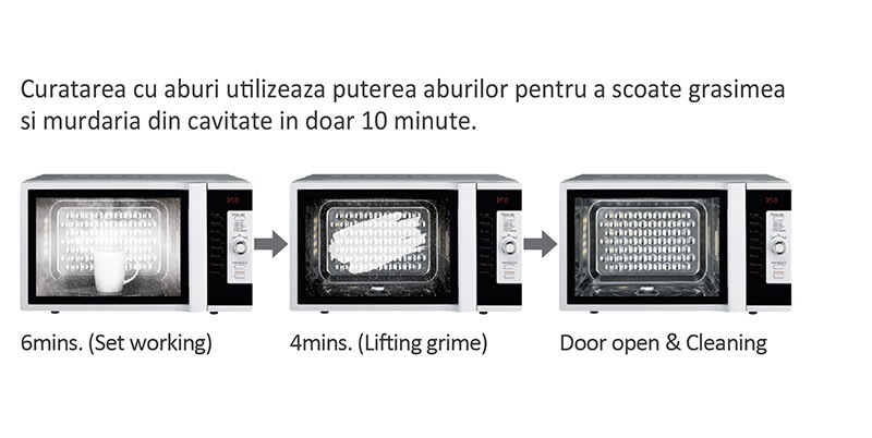 Functia „Steam Cleaning”, foloseste puterea aburilor pentru o curatare mai usoara a petelor de grasime si a murdariei din cavitatea interioara a cuptorului. Astfel cuptorul cu microunde este usor de intretinut in privinta curateniei si nu necesita mai deloc efort din partea utilizatorului. Procesul trebuie urmat dupa fiecare utilizare deoarece are loc o igienizare completa. Timpul estimat curatarii sale este de 10 minute, asa cum este descris de figura de mai jos: