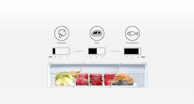 Compartimentul Cool Select Duo ofera cea mai mare flexibilitate pentru depozitarea alimentelor, astfel incat acestea sa ramana proaspete pentru mai mult timp si sa nu isi altereze gustul. Acest sertar este controlat independent folosind 3 la 3 trepte de temperaturi diferite, pentru a crea conditii ideale in functie de tipul de alimente depozitate. Prima categorie cu 3 trepte ajustabile de temperatura face referire la alimente din categoria vegetale, fructe sau legume, a doua categorie carne rosie si ultima peste.