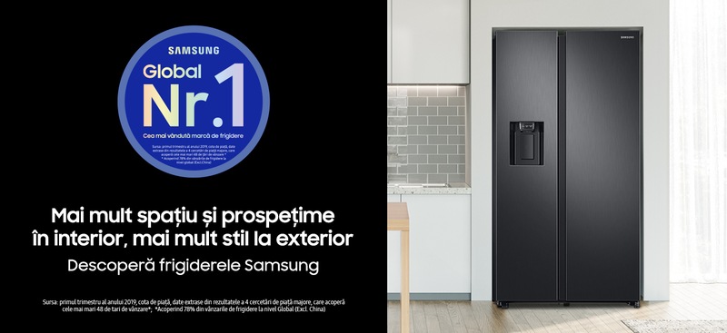 Side by side Samsung RS65R541122C/EO este alegerea perfecta daca iti doresti o combina frigorifica de mari dimensiuni XXL tot mai căutată în România, probabil datorită influenţei filmelor americane, avand la baza cele mai noi tehnologii la un pret foarte bun. Design-ul de top din sticla neagra, contribuie pozitiv la aspectul bucatariei fiind un element tot mai cautat in cazul bucatariilor moderne. Usa de sticla premium ofera un plus de eleganta spatiului tau si creeaza o ambianta rafinata si moderna, potrivita oricarei bucatarii. De asemenea, usile sunt perfect plate, cu manere incastrate care nu ies in afara. Butoanele electronice sunt inlocuite acum de cele cu actionare prin atingere (functie touch-screen), mult mai usor de intuit in alegerea functiilor potrivite pentru regimul termic de la interior. Volumul total de 617 pune pret pe fiecare spatiu, acesta fiind partitionat inteligent pentru a cuprinde la interior alimente de dimensiuni cat mai variate