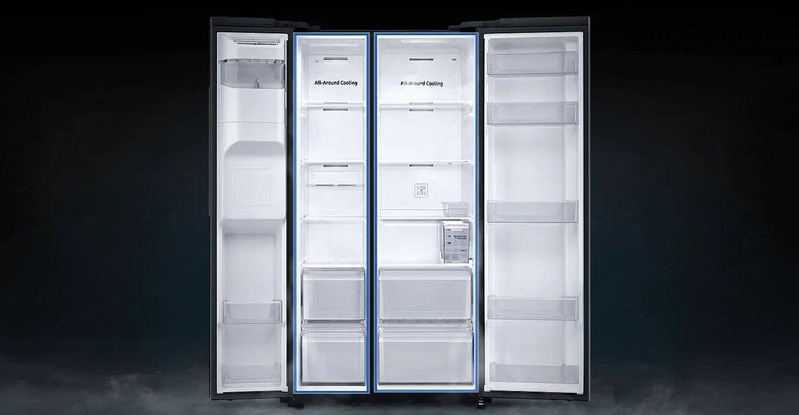 Samsung cu tehnologia dezgheţare automată frigider cat si a congelatorului, este construit astfel încât apa rezultată în urma dezgheţării se aduna într-un locaş special în partea de jos, de unde se scurge în afara frigiderului, într-o tăviţă aflată deasupra compresorului. De aici apa se evapora, ajutată fiind şi de căldura degajată de compresor în timpul funcţionării. Controlul precis si individual al temperaturii pentru compartimentul de refrigerare si compartimentul de congelare al combinei frigorifice Samsung este obtinut prin sistemul All-arround Cooling ce raceste zona de refrigerare in mod egal de la un colt la altul. Aparatul avand debit multiplu ce functioneaza la toate nivelele, prin intermediul unor mici orificii de ventilare de pe fiecare raft, pastreaza o temperatura uniforma in tot frigiderul, in special dupa ce deschidem usa. Prin racirea simultana a tuturor sectiunilor ale tuturor compartimentelor acestei combine, alimentele pot ramane proaspete mai mult timp.