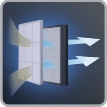 Aparatul este dotat si cu filtrul de inalta eficienta cu 2 niveluri de filtrare ce capteaza si cele mai fine fire de praf înainte ca aerul sa fie evacuat. Un filtru de spuma ultra-performanta este plasat in fata motorului. Si un alt filtru HEPA 12, foarte eficient in retinerea acarienilor, este pozitionat inainte de orificiul de evacuare a aerului pentru a capta chiar si cele mai mici particule de praf eliberate in aer. Acest filtru de spuma este usor de accesat si curatat pentru performanta de lunga durata. Acest tip de filtru capteaza o cantitate mult mai mare de particule de praf, 99.98% din praful aspirat este filtrat, pe care un aspirator obisnuit le-ar recircula in mediul ambiant al casei. Curatarea prin spalare sub jet de apa se face usor, atat pentru filtre, cat si pentru recipientul de praf. Aceasta solutie ingenioasa contribuie la sanatatea intregii familii.