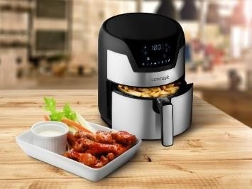 Concept FR3500 este un aparat compact, ideal in cazul bucatariilor moderne, este preponderent de culoare negru/ gri inox si vine dotat cu panou de comanda ce permite setarea comenzilor de lucru intr-un mod intuitiv. Poti alege programul manual si poti personaliza temperatura si durata de coacere a alimentelor tale, sau poti opta pentru celelalte 8 programe prestabilite, cu temperaturi si durata potrivite pentru pui, chipsuri de cartofi, creveti, peste, carne si diferite produse cu blat, spre exemplu pizza sau chiar paine. Timerul integrat poate fi setat timp de până la 30 de minute pentru a preveni arderea alimentelor, în același timp având o precizie perfectă în gătit. Controlul friteuzei FR3500 este foarte simplu si, datorita ecranului tactil mare LED, este clar si intuitiv. Alegeti unul dintre cele 8 programe presetate – friptura, pui, fructe de mare, peste, pizza, cartofi prajiti, coacere, legume. Nu mai trebuie sa va faceti griji pentru restul. Friteuza stabileste singura timpul de gatire si temperatura dorita. Un semnal sonor va informeaza despre incheierea programului.