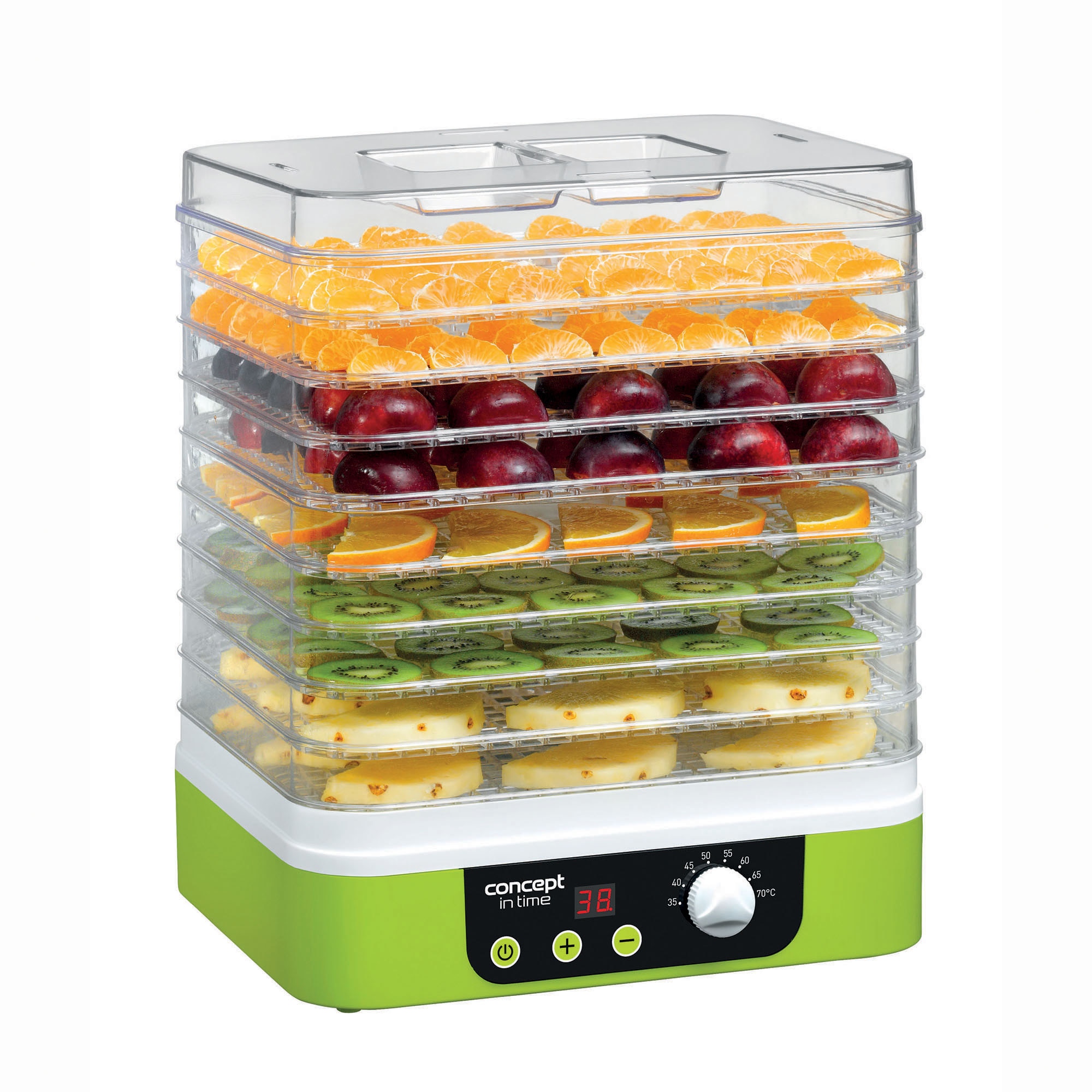 Unitatea este echipata cu 7 tavi transparente de uscare cu care poti deshidrata cantitati mari de fructe si legume simultan cu o variatie a temperaturii de la 35-70 °C. Tavile masoara in diametru 31.3 cm, fiind ideale pentru pregatirea gustarilor raw vegane intr-un timp foarte scurt. Avantajul modelului este uscarea ierburilor. Panoul de comanda este intuitiv si include un buton de oprit/ pornit, butonul TEMP pentru fixarea temperaturii cu + si – si un potentiometru cu functie TIMER ce stabileste timpul de lucru al aparatului. Restul partii de exterior este din plastic, partea de jos de culoare alba in in zona superioara se regasesc cele 7 tavi din plastic transparente ce iti da pozibilitatea sa urmaresti indeaproape intreg procesul.