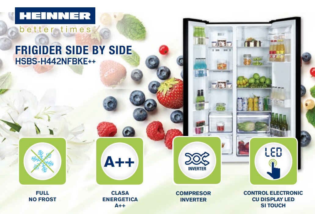 Side by side Heinner HSBS-H442NFBKE++ este alegerea perfecta daca iti doresti o combina frigorifica de mari dimensiuni XXL, dotata cu cele mai noi tehnologii la un pret foarte bun. Culoarea negru lucios de la exterior , de unde putem distinge un ecran LCD clar, usor de citit, care preia comenzile setate de utilizator pentru buna functionare a aparatului frogorific. Acest design datorat materialelor calitative ce inplica constructia aparatului, contribuie pozitiv la aspectul bucatariei care se detaseaza astfel de alte aparate de generatie mai veche. Comenzile de racire sunt preluate automat prin atingere, display-ul LCD avand functie de monitorizare asupra celor doua zone, frigider si congelator.