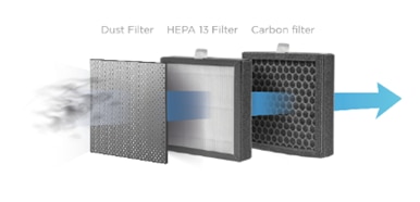 Filtru HEPA 13 – capteaza particule de 0.1 microni cu o eficienta de 99.9% (praf, polen, fum, bacterii, virusi, alergeni, mucegai etc.)